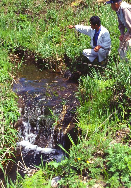 修験僧たちは阿蘇山上を出発し、阿蘇谷から菊池・山鹿を経て筑後国に入り、それから東進して星野・黒木・竹原を通って北外輪の溝辺原野を廻り、坂梨の願成就坂を降りて、日の尾・高岳・阿蘇山上と総行程70里余りの険しい山岳ルートを、30日かけて回峰修行をこなしました。北外輪山上の広大な草原の中に清らかな流れがある故に、修験僧の行者たちも残り2日の工程の野営地をここに定め、長い修業の疲れを癒やしたであろうことが覗えます。