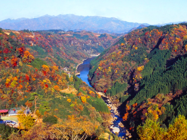 阿蘇郡蘇陽町(現上益城郡山都町)馬見原の竿渡から下流約14㎞にわたる峡谷です。阿蘇外輪山の南東の端が、宮崎県五ヶ瀬町の山塊に突き当たる所は、白岩山(1646)を源とする五ヶ瀬川やその支流が、浸食に弱い凝灰岩を削り、高さ150~200mの渓谷を形成しています。