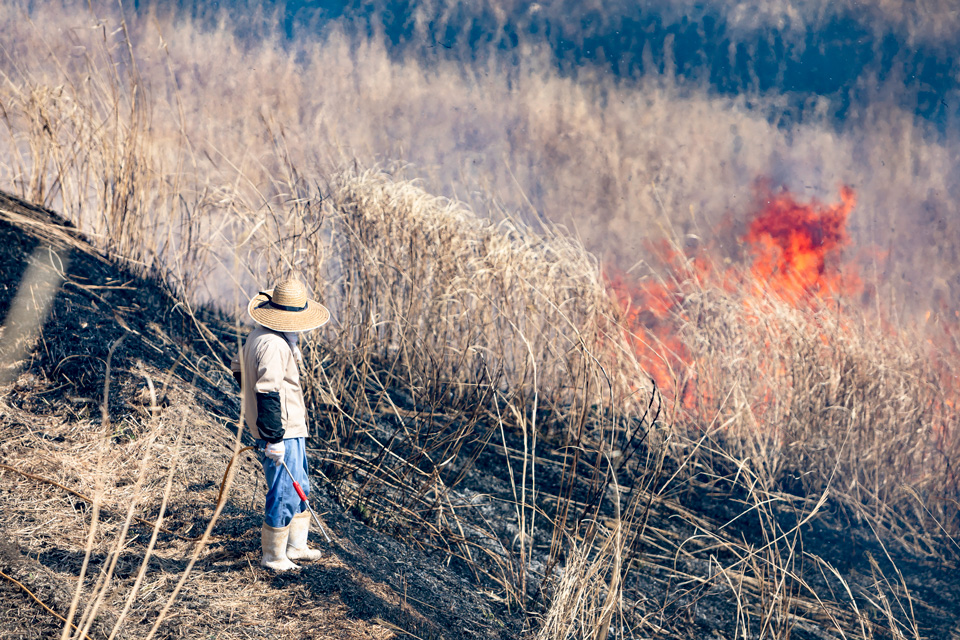 野焼きは枯れ草を効率的に焼却除去し、併せて火に弱い低木類の侵入拡大を防ぎ、地下茎が発達して火に強い草を選択的に残す作業であり、省力的かつ効果的な草地管理技術でもあります。