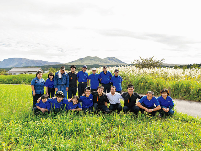 「阿蘇という自然環境に恵まれていることもあり、みなさんがのびのび過ごされています」。副施設長の米川和久さん(写真前列右から四人目)は実感をこめて言う。