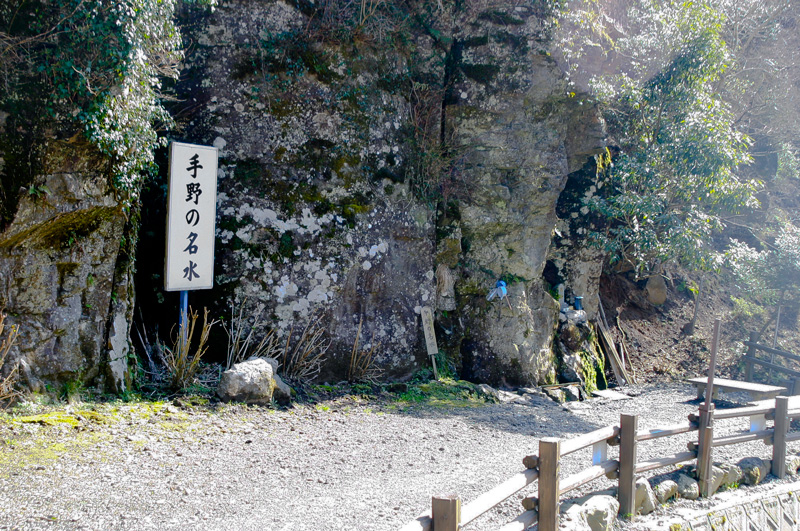 宮の後橋からさらに700㍍ほど道路を上った地点の右上に、約20㍍の断崖がそそり立っている。その下の巨大な阿蘇溶結凝灰岩の割れ目から、湧き水が音をたててほとばしっています。この場所は西手野に住む高齢者有志によって整備され、アジサイが植え込まれ、案内板には「手野の名水」「長寿の水」「癒やしの水」と書かれています。ここも宮川の源流の一つであり、音までが透き通るような清冽さと、源流の勢いと併せて飲むことが癒やしとなり、長寿を招くといわれるのも納得できます。