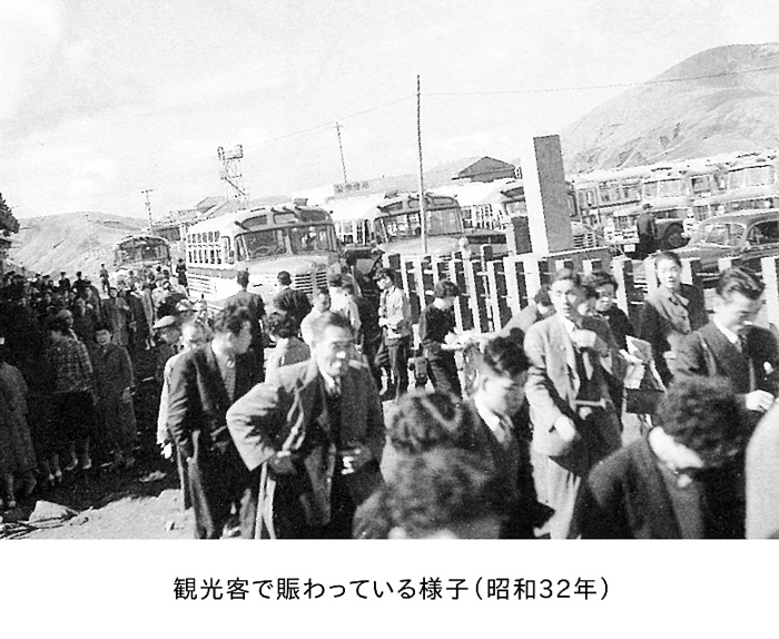 阿蘇山の年間観光客は、昭和32年当時130万人といわれていました。当時、坊中駅から山上までの登山道路の全面舗装が完成すれば、数年のうちに200万人に達するという見込みでした。
