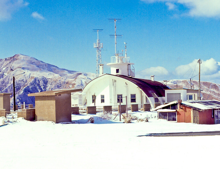 最初は木造であった庁舎も、昭和33年(1958)の爆発で被害を受けたため、翌34年鉄筋コンクリート造となりました。平成10年(1998)3月からは、阿蘇山測候所の業務を阿蘇町黒川にある基地事務所に統合し、常時監視を行っています。