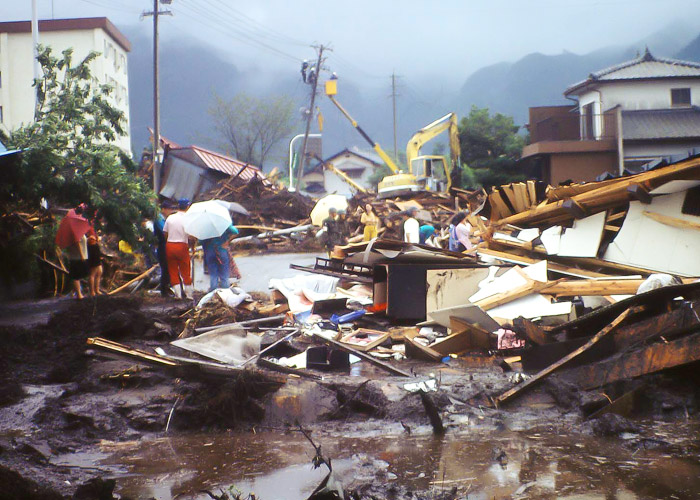平成2年7月2日にも阿蘇では時間雨量60ミリ前後が数時間続く集中豪雨により、雨水を含んだ急斜面の火山灰土層が土石流となり、一の宮町から阿蘇町にかけて、スギやヒノキ約2万本を巻き込み下流の住宅地を襲い、かつてない大水害となりました。阿蘇では梅雨期のほか、8・9月の台風の時期にも大雨が降りやすい。