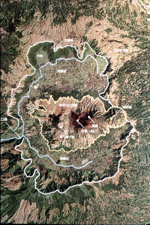 阿蘇五岳の1つである根子岳は、以前は中岳火口丘の一つとして考えられていましたが、少なくとも「阿蘇-3」火砕流より古い火山であることが判明しています。その火山の周囲の壁が後退したため、根子岳は結果的にカルデラ縁の岬に位置し、中央火口丘のように見えています。