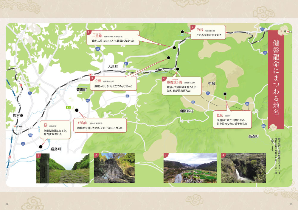 このとき健磐龍命は勢いあまって尻もちをつき、「余はもう立てぬのう」と言ったため、「立野」という地名になったと伝わります。蹴破れなかったところは「二重峠」という地名が残っています。湖には主の大鯰がいて、湖から流れ清いたところが、現在の嘉島町鯰とされています。