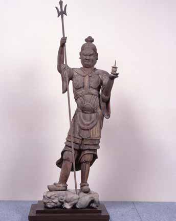 特徴は、髪は縮れて肩までの長さ、肩にショールのような布をかけ、おなかの前で両手を集め、右手に金剛杖、左手に独鈷杵(とっこしょ)を持ちます。