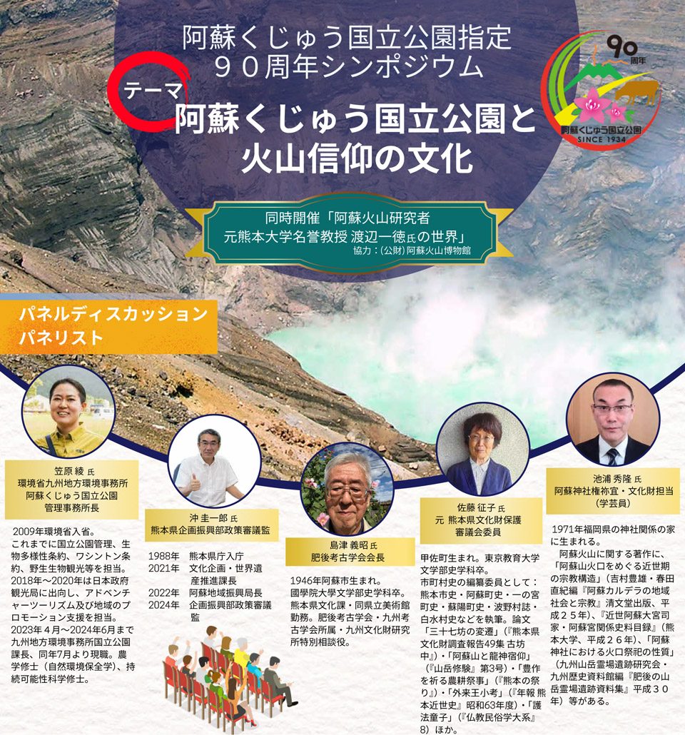 2024年12月4日(水)阿蘇火山博物館3階ホールで「阿蘇くじゅう国立公園指定90周年シンポジウム 阿蘇くじゅう国立公園と火山信仰の文化」が開催されました。当日の議事録を掲載します。