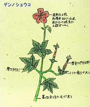 生活 ゲンノショウコ ゲンノショウコ薬草としてのゲンノショウコ生育場所朝鮮(済州島) 本州、四国、九州 山野の草地や路傍、林縁採取時期8月~10月花が咲いている時採る利用部分花や果実のついてた地上部全草薬効整腸(下痢止め)調整法茎は地上にはってよく枝分かれしているから採取するとき根元から採る利用法おなこをこわして下痢し時1日量5~10g、水700ml煎じて300mlにする。 かすは捨てる。参考くらしのあゆみ 一の宮 -一の宮町 伝統文化研究会- 更新日: 2013-09-25 (水) 00:00:00 (4515d)