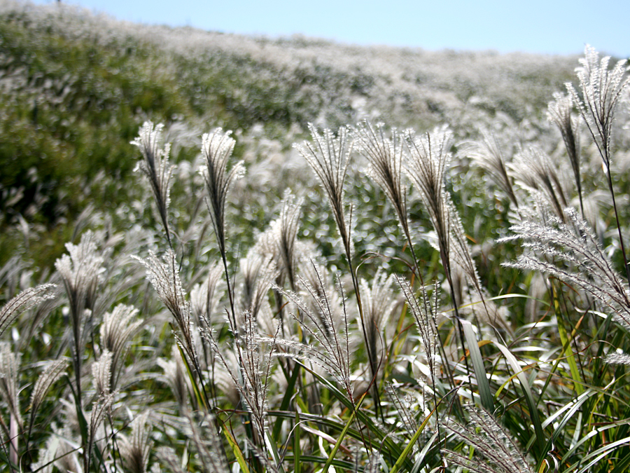 阿蘇の原野にはススキとネザサが主に自生しています。ススキはほかの植物を抑えて成長する力が強く、密集していて、初秋の阿蘇の草原の風景を一面銀色に染めて揺れます。
