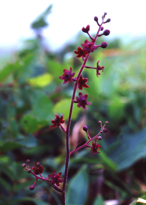 茎先に、枝分かれして全体が円錐状に見える円錐花序を出し、暗い紫褐色をした花径1センチくらいの花をつけます。